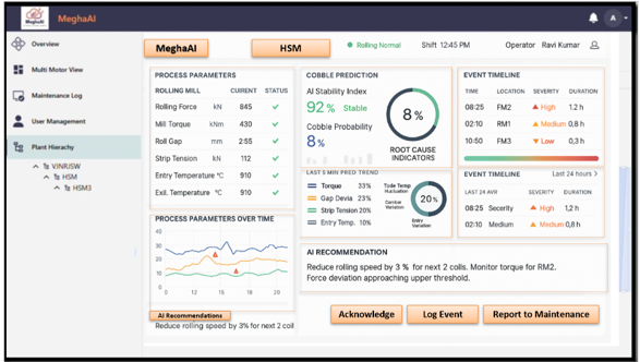 Actionable Alerts: Provides early warnings with countdown to event, risk level, and location-specific insights (e.g., Grade | Finishing Mill).
